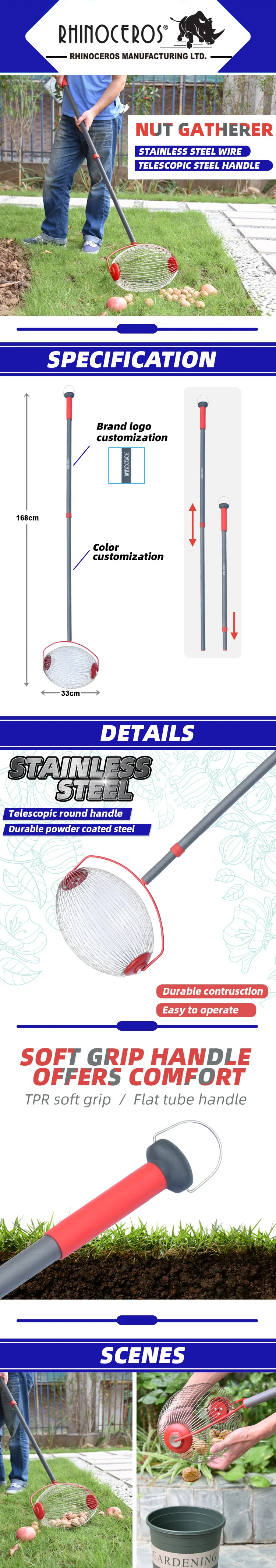 Product Name: Rhino Nut Gatherer Model:8204-27902 Feature: 1.Easy to operate, simply roll over any surface with back-and-force motion. 2.Stainless teel wire which is resistant to rust 3.Durable carbon Steel welded construction, comfortable telescopic handle with storage hook, |