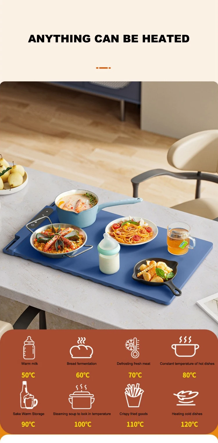 Compact and Rollable Storage: This food heating tray comes with a soft storage strap for easy rolling and storage. Embrace portability and save space effortlessly. After use, simply roll it up and secure it with the strap for space-saving storage. Perfect for RV travel, camping trips and other outdoor activities. Versatile Year-Round Use: Beyond serving as a food warmer, our heating mat is a versatile home assistant. Unlock a range of functionalities, from quick defrosting to facilitating dough fermentation. In order to accommodate your different needs during the winter, you may also use it to raise the temperature of your face mask with this food warming tray.